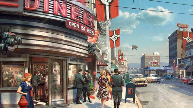 Nel gioco c’è un mix surreale. Il classico sogno americano con cielo azzurro e Diner, le classiche macchine americane e ragazze sorridenti che camminano per la strada. Ma c’è qualcosa di strano in questi ambienti. I caccia nazisti stanno ruggendo nel cielo, in lontananza si intravede una parata nazista e le ragazze sorridenti di prima stanno camminando insieme ad ufficiali tedeschi. Nel gioco, quest’America particolare, popolata da nazisti, vi farà vivere momenti davvero surreali.