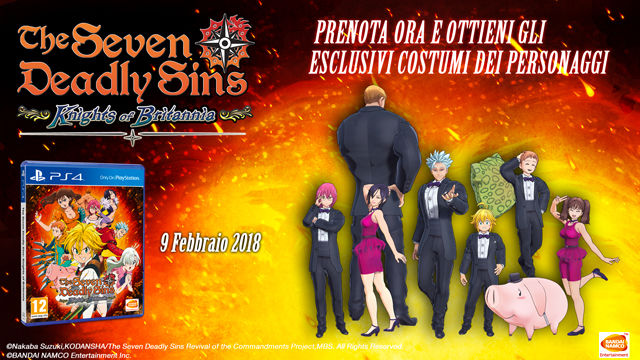 Bandai Namco Entertainment Europe ha aperto le prenotazioni per la versione retail di The Seven Deadly Sins: Knights of Britannia, annunciando che il gioco sarà disponibile in Italia dall’8 febbraio 2018 (dal 9 in digitale). Prenotando il gioco, si otterrà un intero set di costumi formali, che include: Meliodas, Ban, King, Hawk, Diane (formato umano), Escanor, Gowther e Merlin.