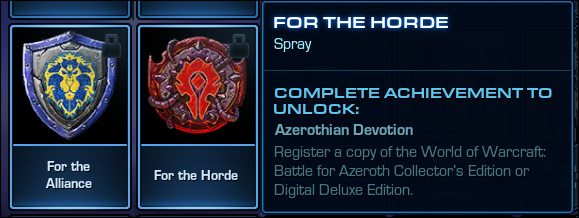 Come da descrizione questi spray dell’Alleanza o dell’Orda saranno sbloccati dopo aver registrato la vostra copia di Battle for Azeroth.