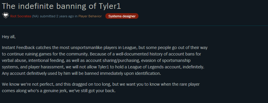 Fu a questo punto che la Riot decise che quel che è troppo è troppo: il 30 aprile 2016 Tyler1 fu bannato permamentemente dal giocare a League of Legends.