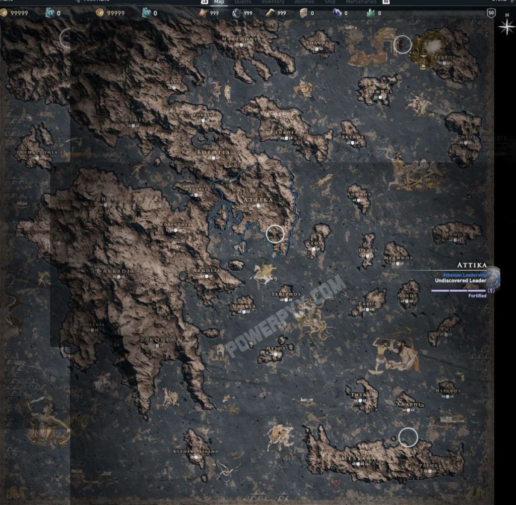 Come si può ben vedere dall’immagine sottostante, la mappa è composta da varie isole al cui interno si trovano varie regioni. In totale ci saranno trentotto aree (o regioni) nella mappa di Odyssey, i cui nomi sono stati compilati da Powerpyx nel rapporto che ha svelato il mondo di gioco di Assassin’s Creed: Odyssey.