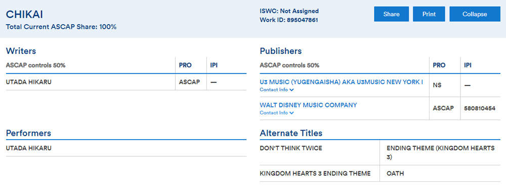Per quanto riguarda il nuovo singolo che già conosciamo di Utada, Chikai / Don’t think twice, il sito ASCAP la riporta come ending per Kingdom Hearts 3. Possiamo quindi aspettarci due tracce esclusive per questo terzo e attesissimo capitolo.