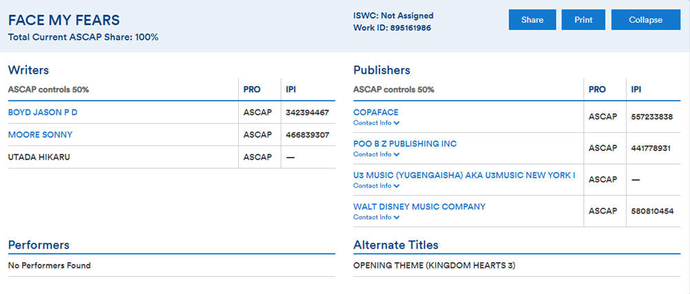 Il sito ASCAP (American Society of Composers, Authors and Publishers) riporta la registrazione di una traccia dal titolo “Face my fears” di Utada Hikaru e Skrillex prodotta da Poo Bear (no, non è Winnie).