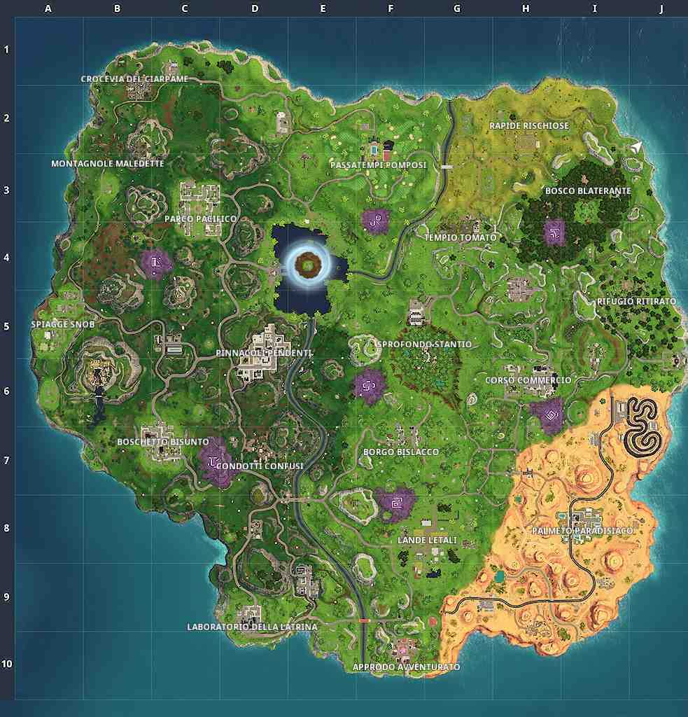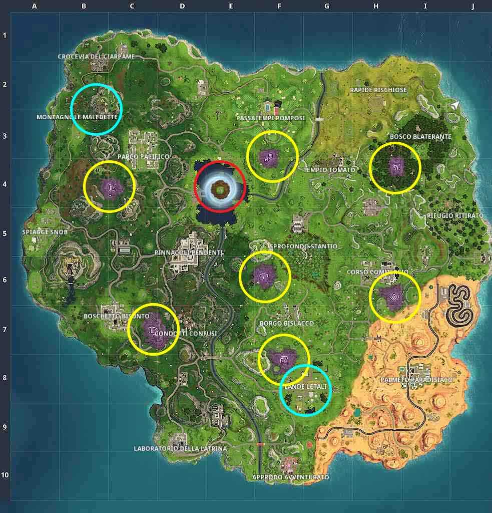 Secondo il patch-log della patch 6.00 di Fortnite i nuovi luoghi sono l’isola fluttuante (segnata in rosso), il campo di granturco (segnato il azzurrino,in corrispondenza di lande letali, vedere per credere), il castello maledetto (segnato in azzurrino anche questo, vicino ad una location maledetta anch’essa) e le varie zone corrotte (segnalate in giallo all’interno della mappa).
