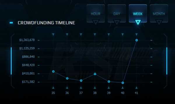 Sul sito del titolo è possibile osservare un grafico realizzato dalla software house stessa che mostra l’andazzo generale del crowdfunding: in sostanza nella settimana del CitizenCon tra acquisti in game e altro la software house si è riportata a casa 1.1 milioni di dollari per lo sviluppo del titolo.