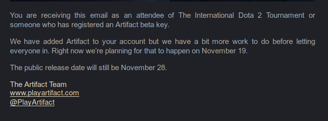 “Questa email è stata inviata soltanto agli spettatori del The International Dota 2 Tournament o a chi ha registrato una beta key di Artifact; abbiamo aggiunto Artifact al tuo account steam ma abbiamo bisogno di lavorare ulteriormente sul titolo prima di aprire una beta. Per questo motivo pensiamo che quest’ultima inizierà ufficialmente il 19 Novembre mentre la release pubblica del titolo rimane fissata per il 28 Novembre.”