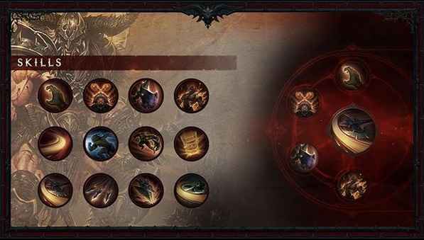 Ogni Classe (Barbaro, Negromante, Monaco, Cacciatore di Demoni, Crociato, Mago) avrà a disposizione un set di 12 o più abilità a seconda della Classe selezionata. Da questa selezione potremmo sceglierne 5 da assegnare alla nostra barra delle azioni.