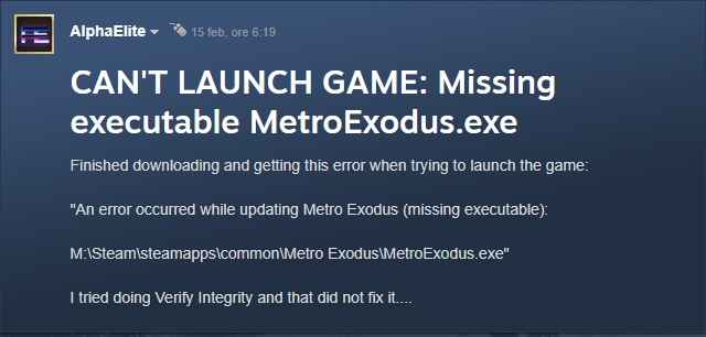 La traduzione in italiano: Terminato il download e ho ricevuto questo errore quando tento di avviare il gioco: “Si è verificato un errore durante l’aggiornamento di Metro Exodus (eseguibile mancante): M: \ Steam \ steamapps \ common \ Metro Exodus \ MetroExodus.exe”. Ho provato a fare Verify Integrity e questo non l’ha risolto.