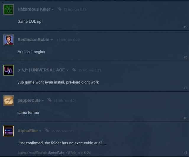 In pratica, chi ha preordinato il gioco su Steam ora si ritrova con un file inutile che non lascia partire il gioco nonostante il download sia andato a buon fine. Il disguido, molto fastidioso, è stato portato all’attenzione dell’opinione pubblica di Steam dall’utente AlphaElite con il seguente post: