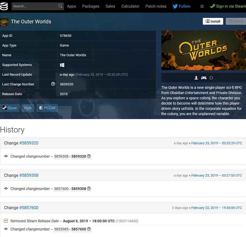 Il database di Steam, conosciuto nel mondo per non perdonare gli errori e per essere piuttosto trasparente, si è visto poi rimuovere la data quasi immediatamente. Quello che purtroppo non ha salvato gli addetti ai lavori questa volta è il changelog delle operazioni fate con il titolo di Obsidian, che conserva un bel 6 Agosto all’interno della storia delle operazioni fatte nel database.