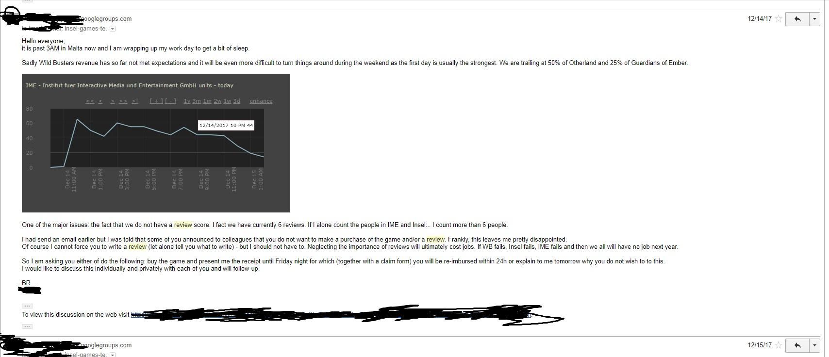 Uno stralcio dell’e-mail porta a galla la situazione che si era venuta a creare. Il CEO costringeva i dipendenti a creare account falsi per recensire positivamente i giochi e paventava anche perdite di posti di lavoro.