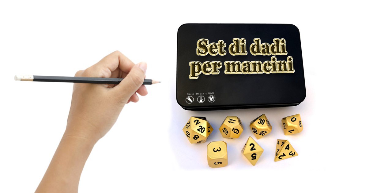 Non preoccupatevi: i vostri problemi finiscono oggi! Con i dadi per mancini di Sesso Droga e D&D potrete sentirvi normodotati come i vostri amici destrorsi! Mai più dadi che volano ovunque, mai più figuracce! La rivoluzione dei mancini è alle porte, dopo le forbici e la tazzina da caffè per mancini, ecco i dadi! Il gioco sarà anche fantasy ma sono finiti i tempi del medioevo dove la sinistra era la mano di satana, divertitevi anche voi a fare 6 6 6 invocando un fulmine.