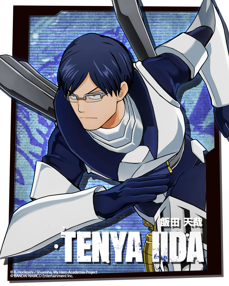 Tenya Iida usa la sua super velocità per essere sempre la prima a soccorrere gli altri. Come rappresentante della Classe 1A, Tenya ha a cuore la sicurezza dei suoi compagni di classe. La sua ispirazione viene dal suo fratello maggiore e vorrebbe diventare un eroe come lui.