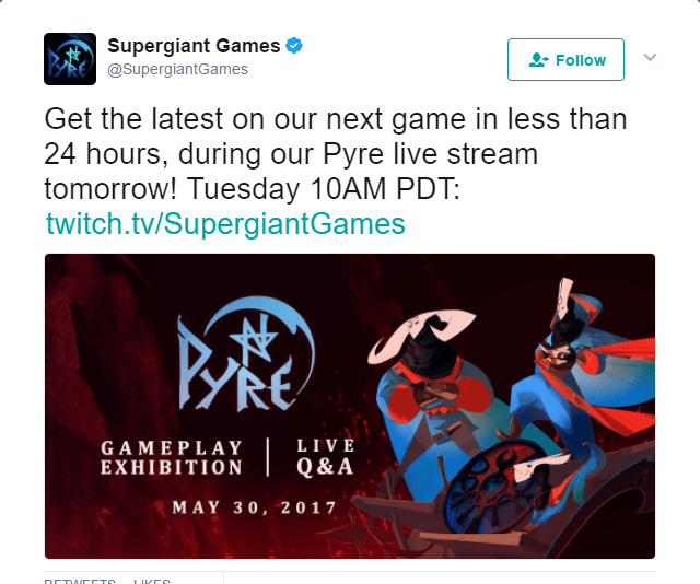 La Supergiant Games, famosa casa indie creatrice di titoli come Bastion e Transistor, ha annunciato attraverso un tweet la presentazione di nuovi contenuti su Pyre alle 19 di oggi tramite uno stream su Twitch.
