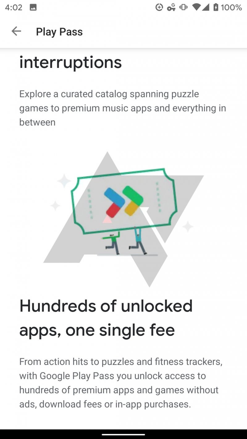 “esplora un catalogo curato che parte dai puzzle games fino alle applicazioni di musica “premium” potendo usufruire di tutto ciò che c’è in mezzo! Dai videogiochi action ai tracker per l’attività fisica ed il fitness, con Google Play Pass puoi avere accesso a centinaia di applicazioni premium e a centinaia di videogiochi senza doverti preoccupare della presenza di pubblicità, di costi legati al download o senza dover compiere acquisti all’interno dell’app stessa”