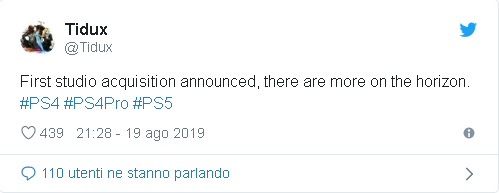 Pare che secondo le dichiarazioni su Twitter dell’insider Tidux, la SONY non è intenzionata a fermarsi a Insomniac e diverse altre acquisizioni verranno presto annunciate, accompagnando il suo commento con gli hashtag PS4, PS4 Pro e PS5.