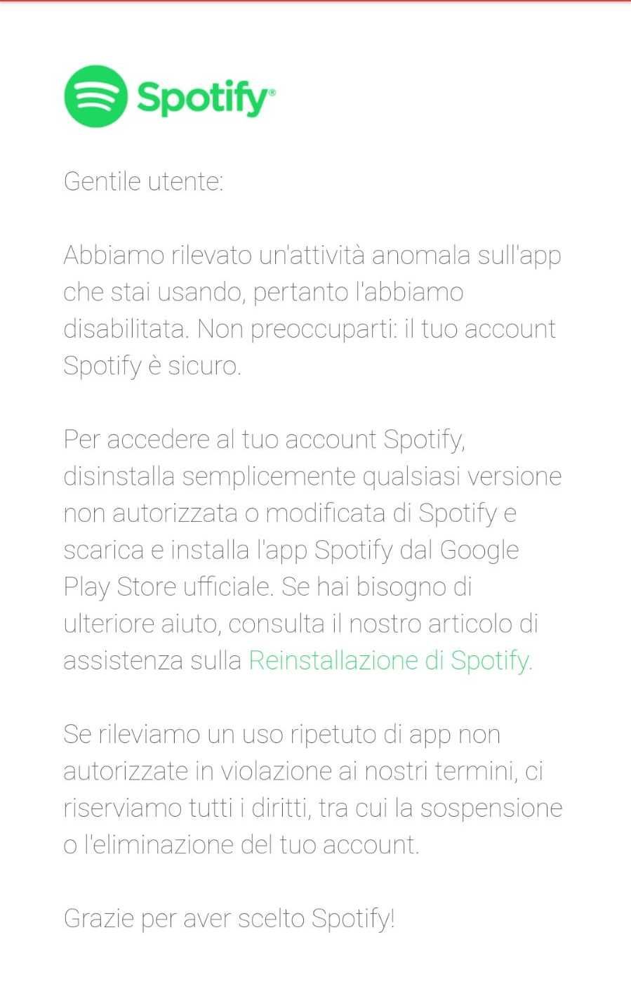 Gentile utente abbiamo rilevato un’ attività anomala sull’app che stai usando, pertanto l’abbiamo disabilitata. Non preoccuparti: il tuo account Spotify è al sicuro. Per accedere al tuo account Spotify disinstalla semplicemente qualsiasi versione non autorizzata o modificata di Spotify e scarica e installa l’app Spotify dal Google Play Store ufficiale. Se hai bisogno di ulteriore aiuto, consulta il nostro articolo di assistenza sulla Reinstallazione di Spotify. Se rileviamo un uso ripetuto di app non autorizzate in violazione ai nostri termini, ci riserviamo tutti i diritti , tra cui la sospensione o l’eliminazione del tuo account