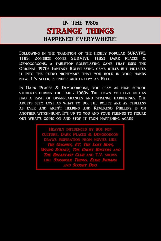 Dark Places & Demogorgons è un gioco divertente e ben strutturato. Il manuale è pieno di spunti per ideare le storie da giocare. Vi sono infatti numerose idee per avventure, personaggi pregenerati ed esempi di gioco oltre a elenchi dettagliati di armi, mostri e armature (tra queste, viene persino annoverato un bidone dell’immondizia…).
