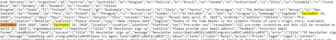 Come potete vedere nell’immagine qui sopra, il titolo sembra essere proprio Shadow of the Tomb Raider, anche se potrebbe comunque essere stato inserito in maniera provvisoria tanto per riempire quella stringa. Il codice indica anche che si tratta del finale delle avventure di Lara. Un altro dato importante, però, riguarda la data di uscita. Dal codice sorgente pare che si possa risalire anche a quella.