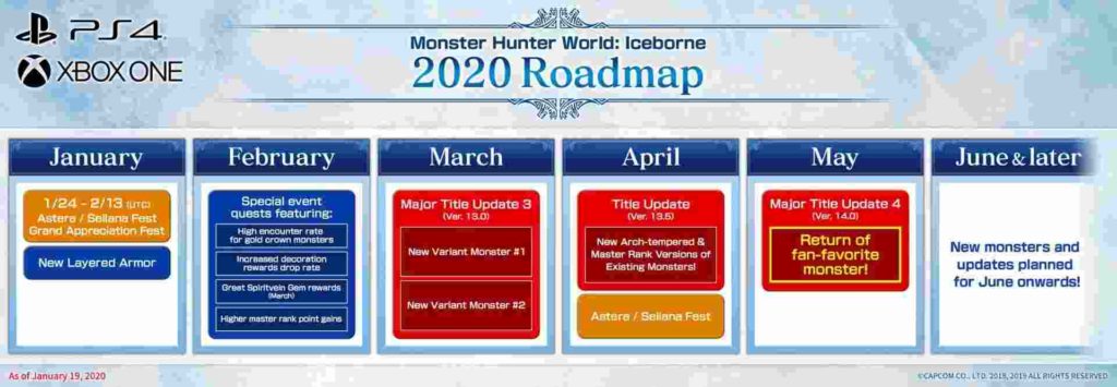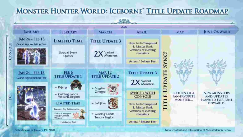 Gennaio per Monster Hunter World sarà mese di eventi e questi accadranno in contemporanea su entrambe le versioni; l’evento Grand Appreciation Fest durerà dal 24 Gennaio al 13 Febbraio. Febbraio vedrà per la versione console di Monster Hunter World Iceborne l’arrivo di delle quest a tempo limitato mentre la versione PC riceverà finalmente il Rajang e l’ambientazione Guilding Lands Volcanic Region. Marzo sarà il mese per vedere l’arrivo, sulla versione PC del gioco, dello Stygian Zinogre e di Safi’Jiiva. Per quanto riguarda Aprile, mese in cui si raggiungerà la tanto agognata parità tra versioni, farà si che su PC e console si potranno affrontare nuove versioni di mostri già esistenti.