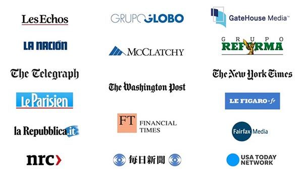 The New York Times, Le Figaro, Financial Times, The Washington Post, Fairfax Media, McClatchy, The Mainichi, NRC Media, Les Échos, Gatehouse Media, Grupo Globo, La Nación, Le Parisien, Reforma, USA Today Network, The Telegraph e, per l’Italia, la Repubblica.