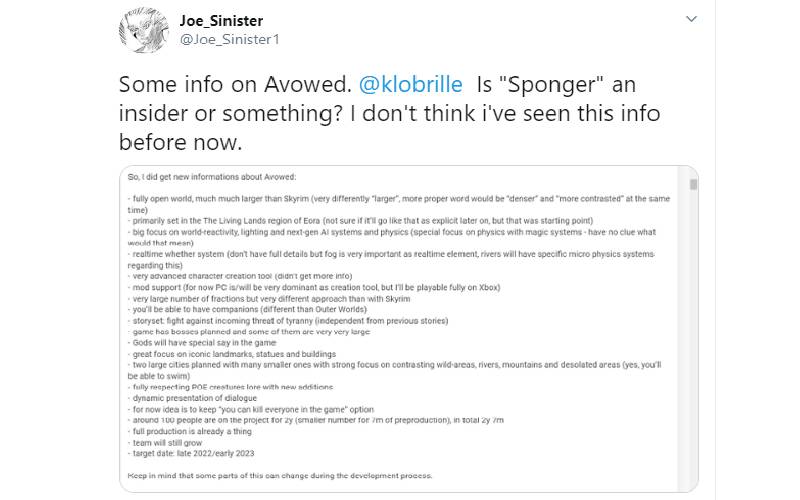 Joe Sinister ha infatti diffuso una lista di features (confermata dalla testimonianza di Klobrille, importante insider Xbox Studios, qui il link), il nuovo gioco di Obsidian promette di puntar tutto su parole chiavi come narrativa ambientale, un open world che appare davvero massiccio e ancor più vasto di Skyrim e un supporto importante alla community di modders.