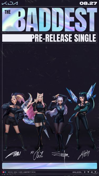 Il gruppo debuttò nel 2018 con la hit POP/STARS, oggi THE BADDEST è il secondo brano delle K/DA ed è in uscita insieme a un video musicale con testo.