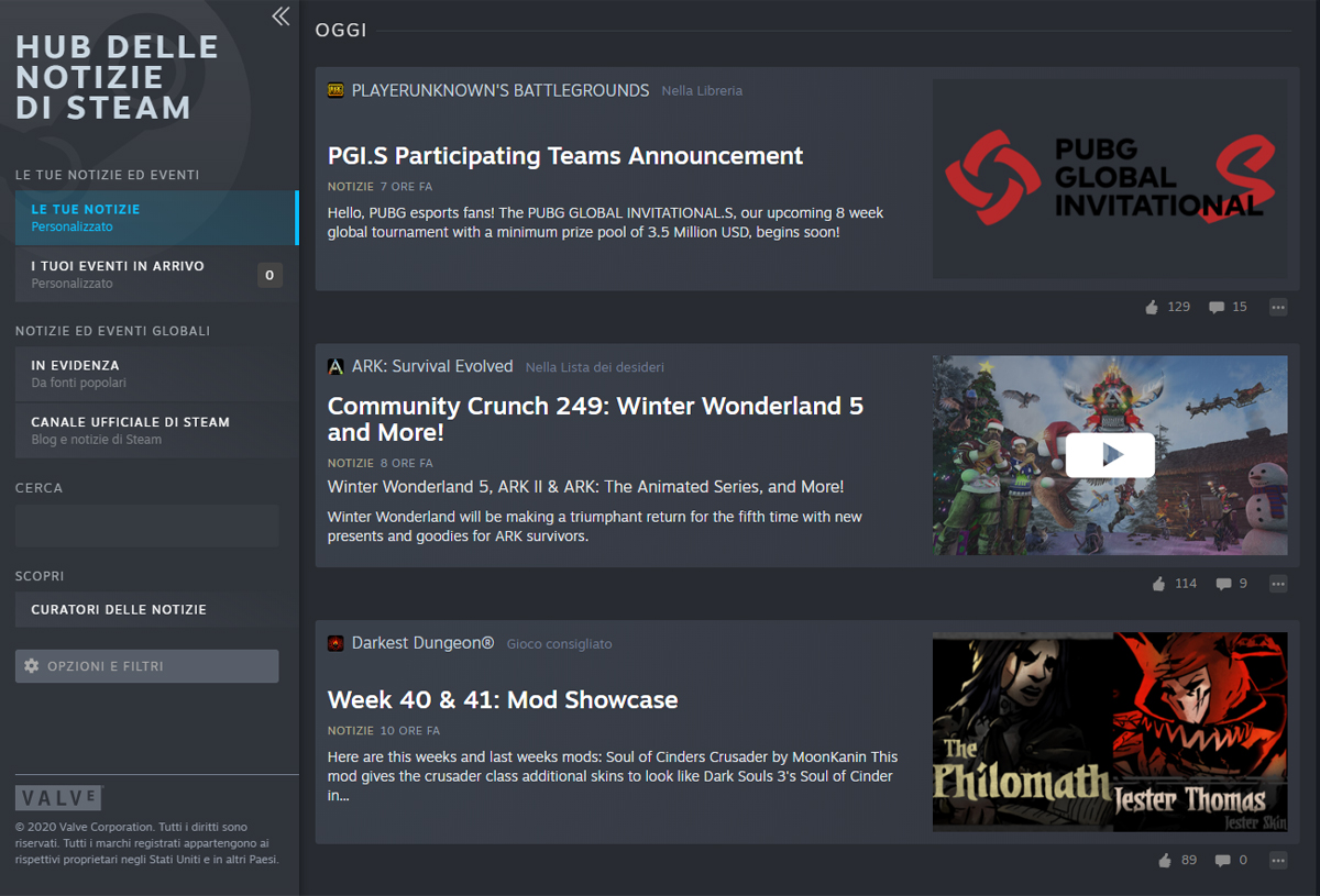 Il feed delle notizie in precedenza includeva solo una manciata di siti videoludici, ma ora grazie al sistema dei Curatori di Steam ci sono dozzine di fonti in tutto il mondo che possono raggiungere l’utente nel proprio hub. La funzione non offre solo informazioni, e infatti in futuro sarà anche un modo semplice per scoprire eventi in arrivo e richiedere promemoria tramite e-mail o tramite notifiche sull’app nei dispositivi mobile.
