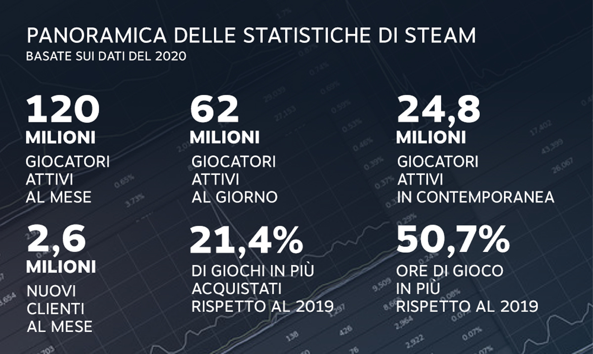 Nonostante la concorrenza spietata a suon di giochi gratis di Epic Games Store, è possibile che il 2021 possa essere un altro anno di record per Steam, dato che già lo scorso 2 gennaio ha registrato il maggior numero di giocatori contemporaneamente online (25 milioni). È la stessa Valve, però, ad attribuire gran parte di questo exploit alla pandemia del coronavirus, che ha costretto a casa molte più persone del solito, spingendo a provare il servizio di Steam per la prima volta o semplicemente a tenerlo più attivo con i videogiochi.