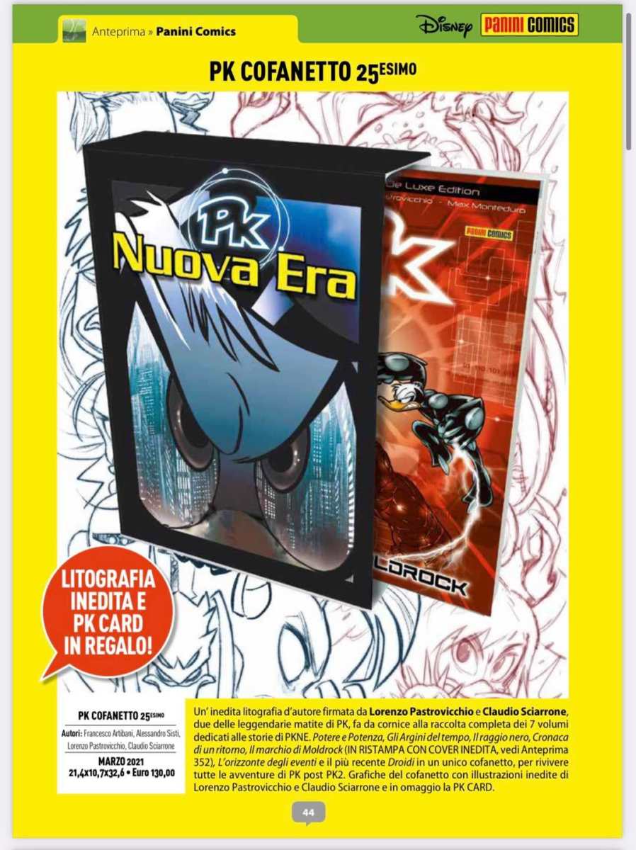 - Cofanetto PKNE (PK Nuova Era) questo raccoglierà le 7 storie del nuovo ciclo di PK quindi: Potere e potenza, Gli argini del tempo, Il raggio nero, Cronaca di un ritorno, Il marchio di Moldrock, L’orizzonte degli eventi e Droidi, ognuna in un volumetto cartonato da collezione. Inoltre ci sarà una stampa inedita e a tiratura limitata della PK Card, nostalgico omaggio alla PKard che un tempo veniva spedita a tutti quei lettori che scrivevano alla redazione del magazine. Tutto questo ad un prezzo di 130,00 euro.