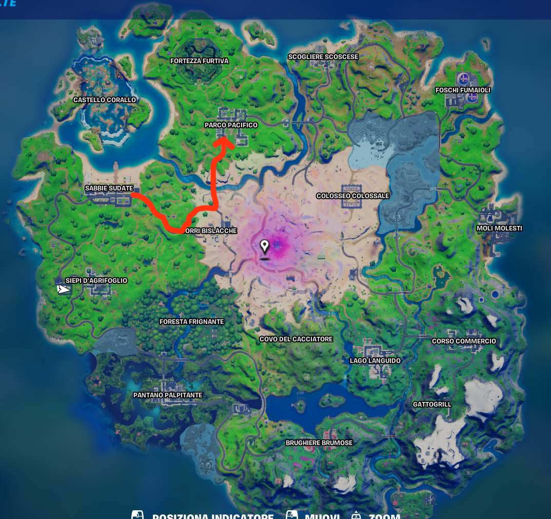 Questa sfida, esattamente come una sfida citata di poco sopra, chiede al giocatore di prendere un veicolo presso la location di Parco Pacifico e di guidare poi lo stesso verso Lago Languido. Per evitare problemi relativi all’affollamento della parte centrale della mappa, vi consigliamo di fare il giro lungo e passare nelle vicinanze di frutteto come nella mappa da noi realizzata per voi qui sopra.