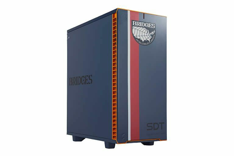 Sul fronte del case di Death Stranding è dipinto il logo di Bridges, posto al di sopra anche della tripla banda colorata, mentre sulle fiancate, da un lato troviamo il nome dell’azienda e dall’altro l’acronimo SDT (Special Delivery Team). I dettagli esterni e interni, come le prese d’aria o la ventola di raffreddamento, sono colorati con un appariscente arancione. All’interno il case può montare una normale scheda madre ATX, con due supporti dedicati agli hard disk sia da 3.5 pollici che da 2.5.