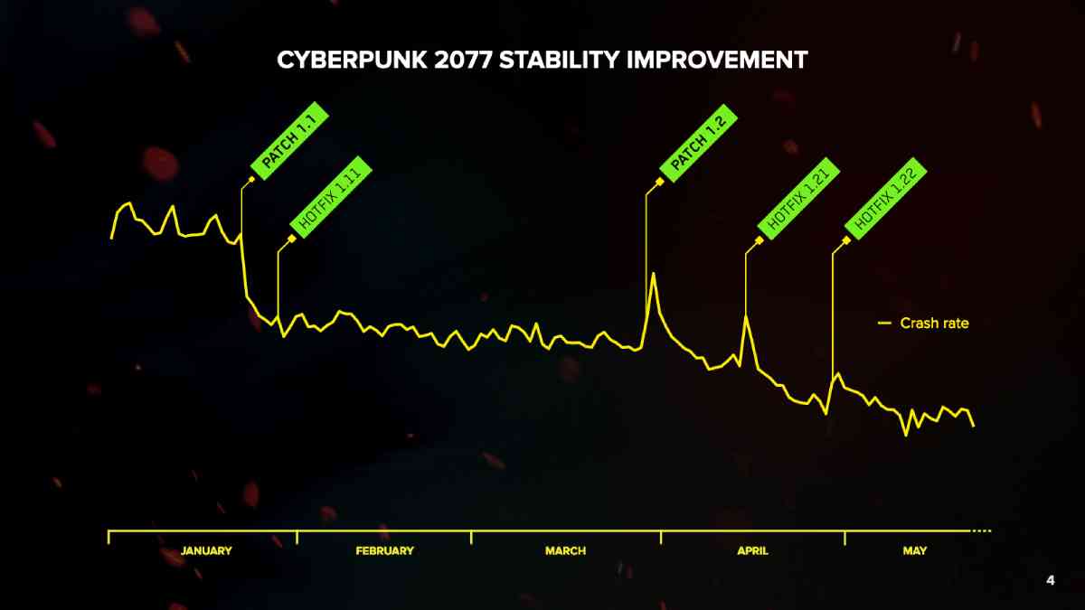 La società ha anche condiviso il grafico “Cyberpunk 2077 Stability Improvement”, che mostra come il numero di crash è sceso ogni patch e hotfix successivi.