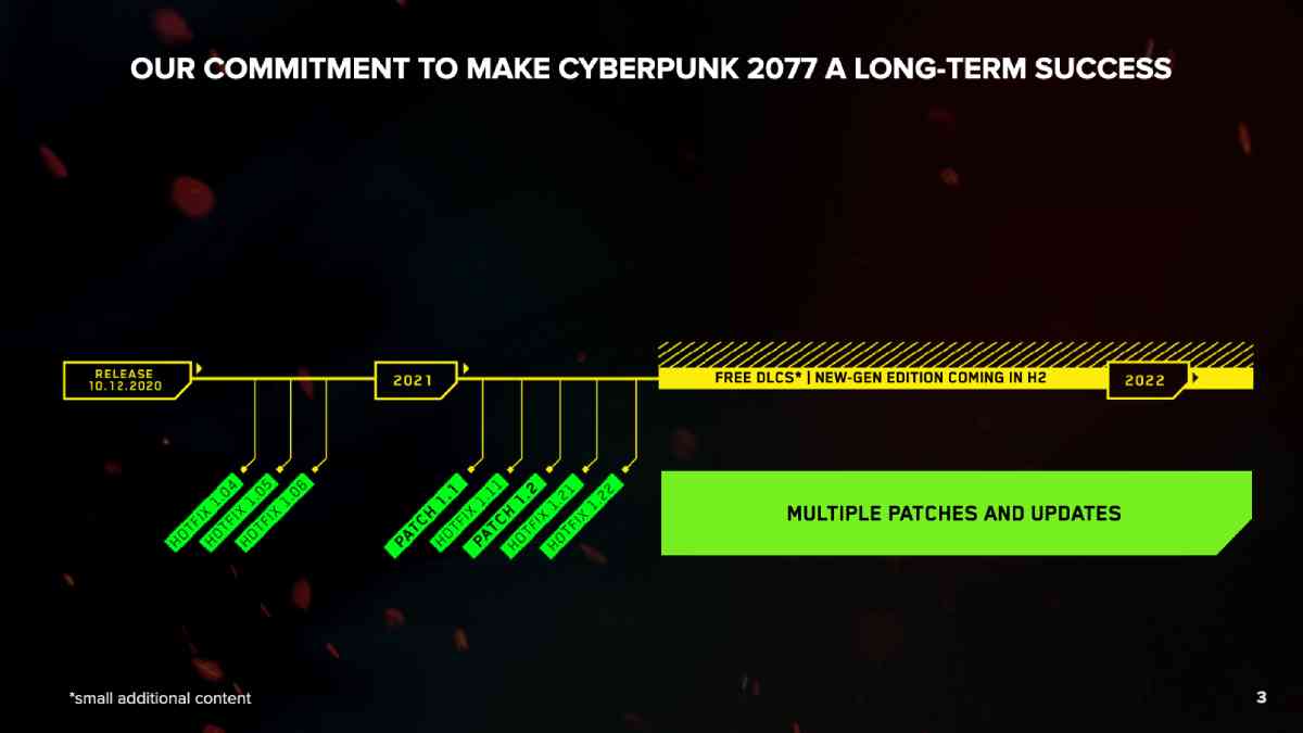 Nella sua presentazione, CD Projekt ha condiviso una linea temporale del suo “Impegno per rendere Cyberpunk 2077 un successo a lungo termine”, e mostra anche i DLC gratuiti e le edizioni next-gen previste nel corso del 2021, oltre a patch e aggiornamenti.