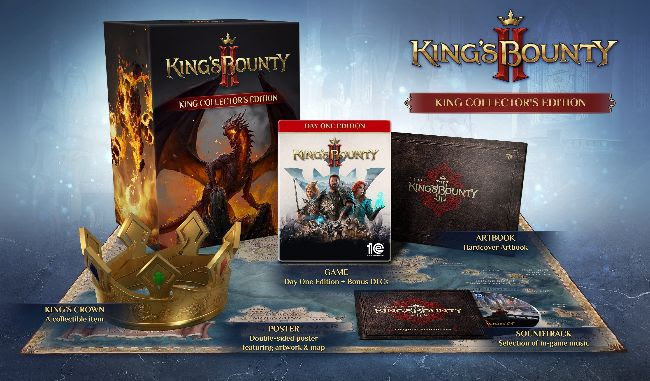 L’edizione per i giocatori collezionisti, la King Collector’s Edition, è esclusivamente fisica e include al suo interno, oltre a tutti i bonus precedentemente descritti, anche un doppio poster, un artbook di 36 pagine, la soundtrack ufficiale in formato fisico e, soprattutto, una vera corona da Re! I pre-ordini della King Collector’s Edition di King’s Bounty 2 apriranno a breve su questo sito.
