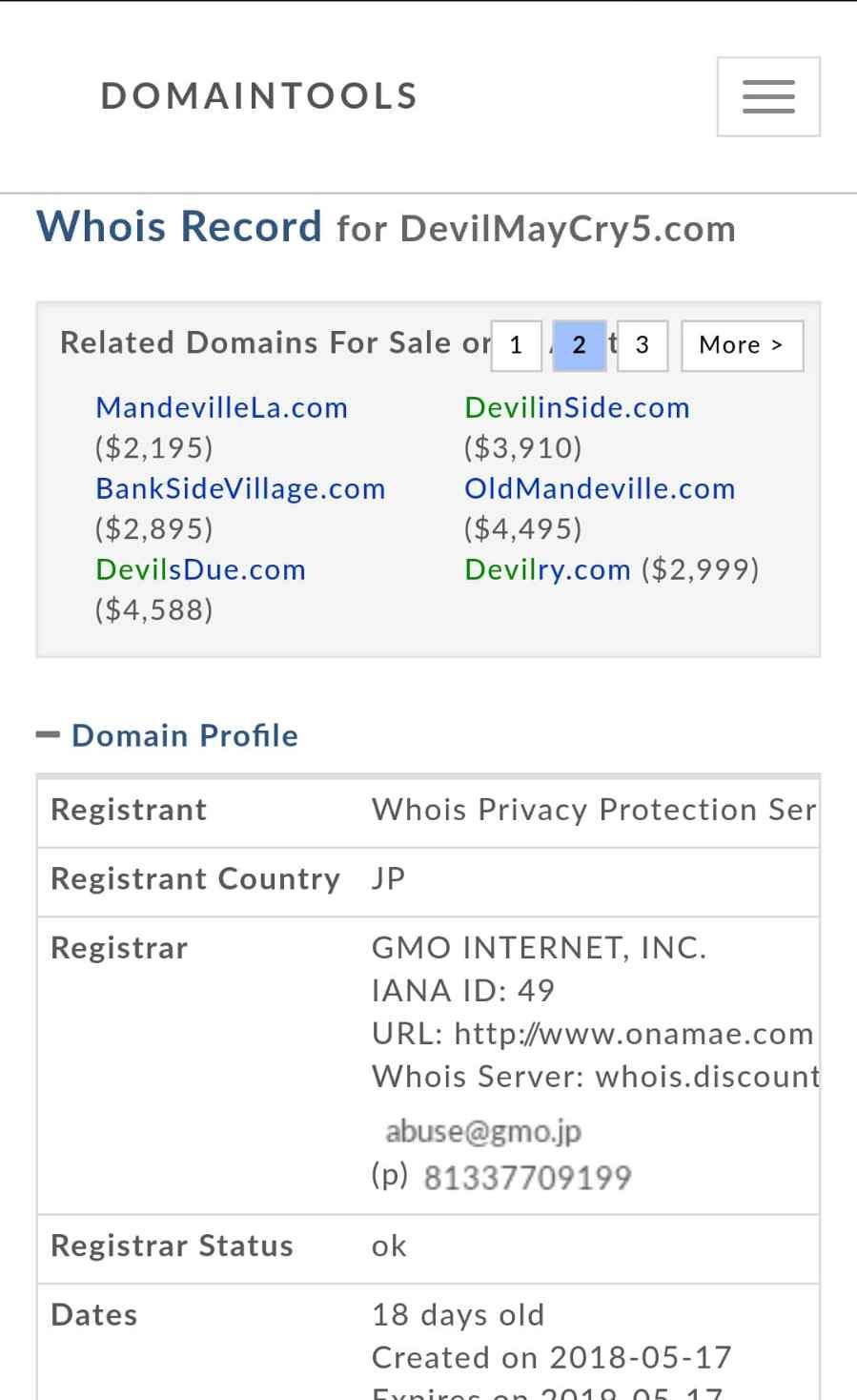 Oltre a Devil May Cry 5, usando sempre Whois, è possibile trovare i domini di Devil May Cry 6, Devil May Cry 8 eDevil May Cry 9 sempre registrati attraverso Onamae. È lecito credere che Capcom abbia registrato tutti questi domini per evitare di vederseli soffiati sotto il naso, esattamente come è accaduto per Devil May Cry 7 che è stato registrato da un’ entità differente, probabilmente non collegata all’azienda giapponese.