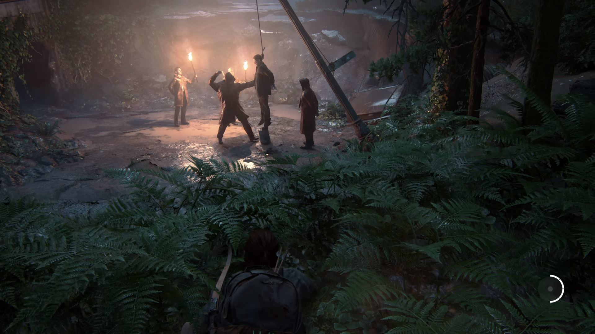 Il trailer inizia in un grande capannone adornato identico alla sala dove il gioco viene mostrato. Vediamo una Ellie cresciuta dialogare e scherzare con Jesse, un ragazzo dalle fattezze asiatiche, probabilmente membro della comunità di sorpavvissuti in cui ha iniziato una nuova vita. I due vengono interrotti dall’arrivo di una ragazza Dina con cui Ellie ha una relazione amorosa. Siamo sicuri che il legame tra le due ragazze sarà fondamentale nella storia del gioco che, come annunciato negli anni scorsi, avrà come tema principale la vendetta. Allo stesso modo, dopo questo trailer, è ormai certo che il focus del gioco sarà su Ellie e non più su Joel che non appare una sola volta nei 12 minuti della conferenza dedicati a The Last of Us 2. Segue un cambio di location, siamo in una foresta, probabilmente in un campo di cacciatori e vediamo la nostra ragazza tagliare la gola ad un uomo. Le scene sono più crude e splatter rispetto al primo capitolo. In seguito inizia la sequenza di gameplay.