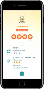 Aumentare il livello di amicizia con un utente permetterà al giocatore di ottenere numerosi bonus come, ad esempio, un costo ridotto per la polvere di stelle necessaria per gli scambi, la possibilità di infliggere danno extra al nostro avversario durante le lotte per la conquista di una palestra se si combatte con un amico e una maggiore quantità di premier balls durante i raid se si è in compagnia di un amico.