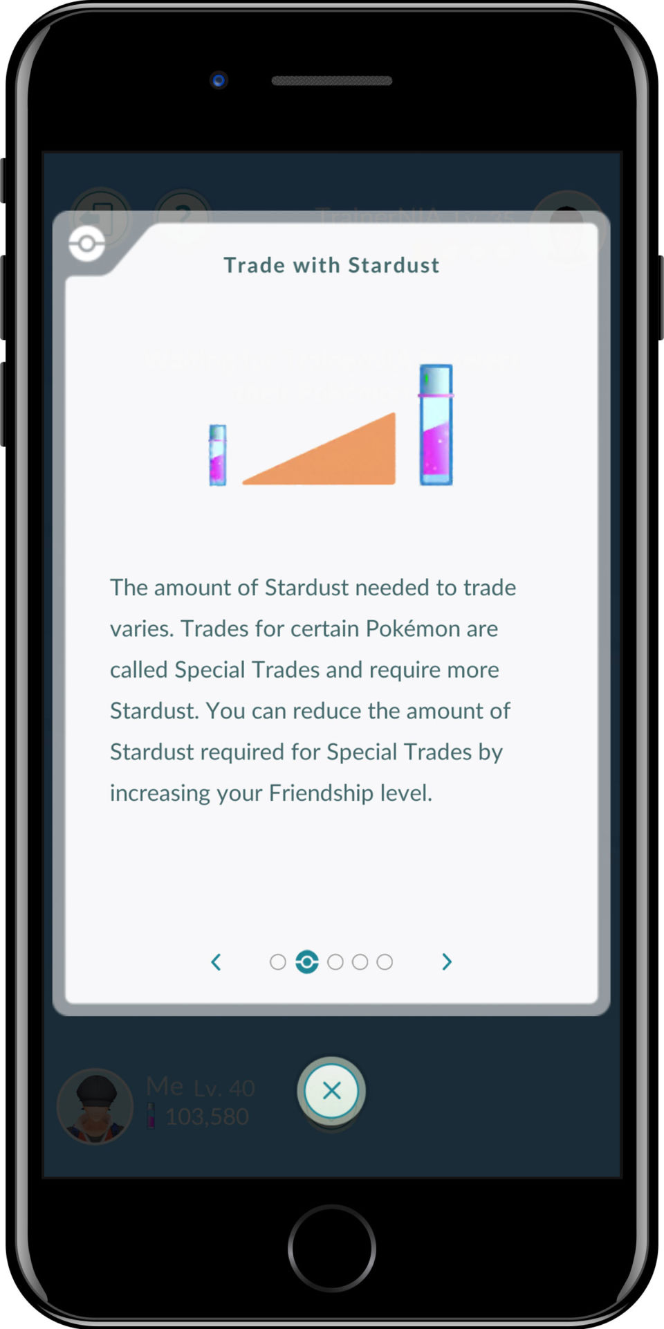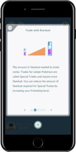 Tutti gli scambi per essere effettuati hanno bisogno di polvere di stelle come moneta di scambio; si possono ottenere sconti sulla quantità di polvere di stelle necessaria per effettuare lo scambio solo grazie alla tipologia di livello amico che si ha con il proprio avventore. In uno screenshot dimostrativo Niantic mostra come per uno scambio speciale ci siano di mezzo ben 1.000.000 di polvere di stelle; con il livello di amicizia “Miglior amico” tale prezzo scende a sole 40.000.