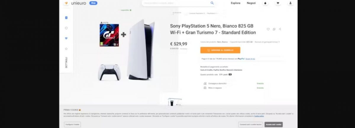 La pagina della truffa è identica praticamente in ogni dettaglio alla pagina ufficiale di Unieuro, replicando anche gli stessi identici popup e cookie, quindi fate attenzione perché è davvero facile lasciarsi ingannare. Se volete comprare questa PlayStation 5 che non arriverà mai, potete pagare solamente tramite PayPal o Klarna.
