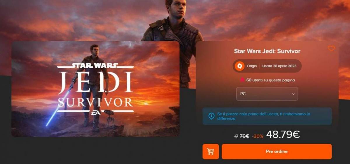 Grazie agli sconti di Istant Gaming, potete preordinare il nuovo Star Wars Jedi per PC (che ricordiamo uscirà il 28 Aprile) scontato del 30%: se volete acquistare il gioco spendendo 48,79 euro, al posto dei 70 euro standard, vi basterà cliccare qui e troverete la pagina dell’offerta! Come potete vedere dall’immagine, se il titolo riceverà un ulteriore sconto dopo che l’avrete acquistato, la differenza vi verrà rimborsata!