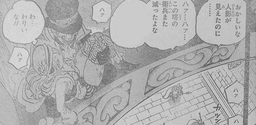 Il capitolo inizia dentro il castello Pangea di Marijoa. Vediamo Sabo affrontare le guardie con le sue fiamme per rubargli le chiavi e Bonney incrociarsi con lui. I due si riconoscono e realizzano di avere lo stesso obiettivo, quello di liberare Kuma. Mentre scappano viene comunicato tramite l’altoparlante della presenza di un intruso nella stanza delle guardie che è riuscito a rubare le chiavi dei collari degli schiavi.