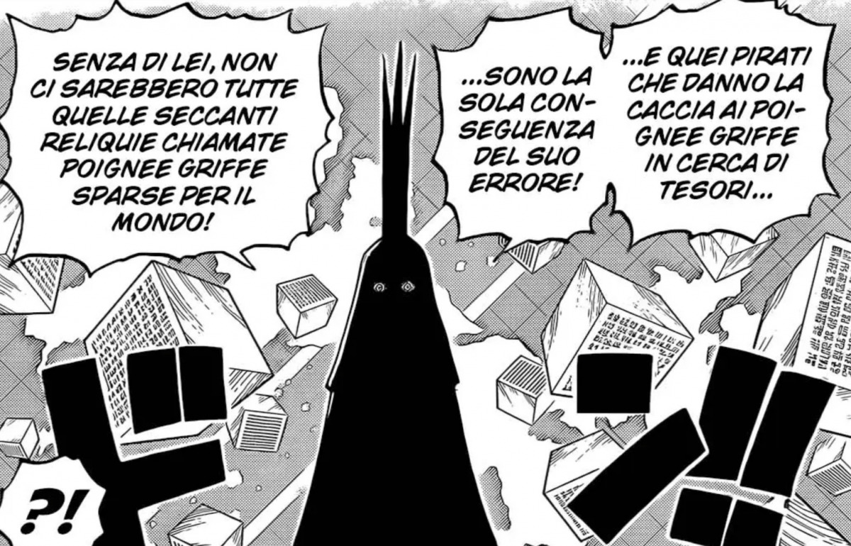 Abbiano anche nuove informazioni sulla D che sembrano più che altro delle conferme. Sapevamo già che i D sono i nemici naturali degli dei, ma con l’introduzione dei lunariani alcuni stavano cominciando a credere ci si riferisse alla razza alata. Personalmente penso che Corazon facesse riferimento ai Nobili Mondiali, anche perchè lui lo era. Inoltre Doflamingo a Dressrosa viene sconfitto proprio da Rufy che è ha la D, di dubbi quindi ne avevo pochi. È sempre bello però avere una conferma di questo tipo. Im afferma che la D apparteneva ai loro nemici, ma coloro che oggi vantano quel nome non sono nient’altro che involucri di carne in quanto non consapevoli della loro importanza nella storia.