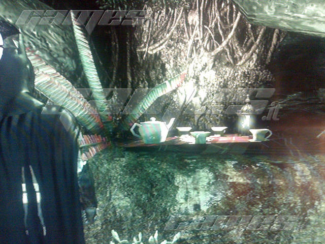 Vicino al grande cancello dell’entrata dell’Arkham Asylum, guardate a destra per notare un gioco per bambini con inchiodati alle 2 estremità dei cappelli come quelli di Tweedle-Dum e