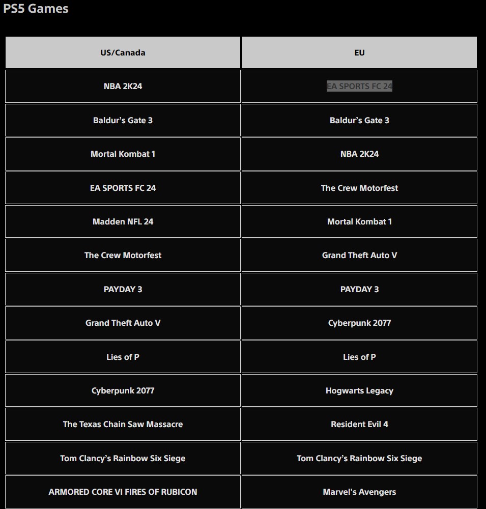 Quali sono gli altri titoli che stanno macinando download su PS5? A parte le simulazioni sportive di cui sopra, hanno ottenuto buoni riscontri di vendite anche Mortal Kombat 1, Lies of P e Payday 3. Inoltre si segnala la presenza dell’immortale GTA V in entrambe le regioni, mentre Armored Core Vi: Fire of Rubicon ha fatto più fatica ad imporsi, figurando nella sola classifica di vendite americana (vi ricordo comunque che si parla dei soli giochi scaricati, quindi escluse le copie fisiche).