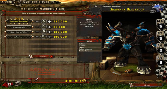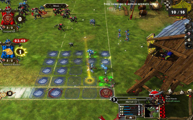 Delle modalità di gioco se ne può parlare in eterno ma quello che mi preme sottolineare è che Blood Bowl è stato pensato come un titolo a metà strada fra il GDR e il manageriale sportivo: difatti prima di ogni partita si potranno settare o eventualmente allenare gli stessi giocatori, comprare nuovi membri della lega o addirittura opzionare alcune nuove strategie o bonus sul campo che possono andare dall’aggiunta di un guaritore fino al pagamento della mazzetta all’arbitro per chiudere un occhio sulle vostre scorrettezze. Ben fatto e divertente la parte dedicata all’allenamento dei giocatori, sempre puntato sul gioco di ruolo tant’è che molte volte l’allenamento potrebbe anche non andare a buon fine e la penale sarà che il giocatore non potrà essere controllato nelle partite seguenti – pena successiva l’esborso di una somma di denaro aggiuntiva per comprare un secondo giocatore di quella fascia.