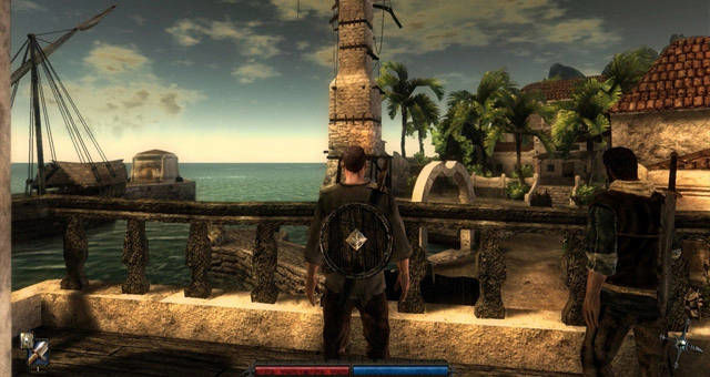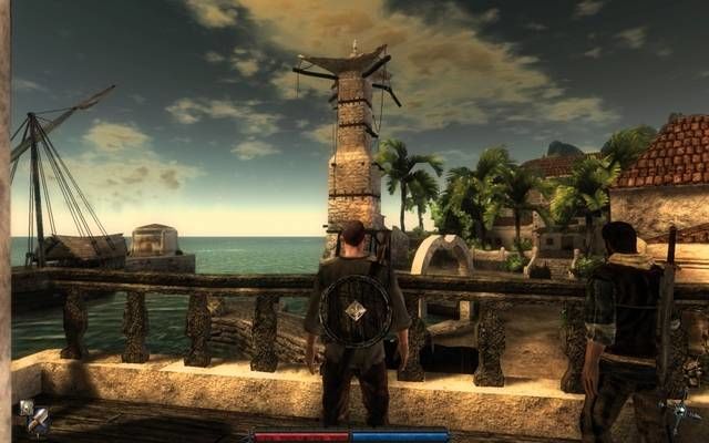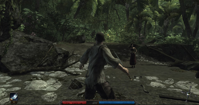 Il personaggio che andremo a guidare lungo tutta la storia di Risen è un senza nome e senza storia, di lui si conoscono pochissime cose e oltre alle poche informazioni che ci fornirà lui stesso, rimarremo abbastanza all’oscuro del suo passato: quello che conosciamo è il presente e quello che ne seguirà dalle sue (vostre/nostre) azioni di gioco, lo potremo livellare personalmente. Se devo essere da subito sincero, non ho assolutamente gradito la scelta dei programmatori di banalizzare il personaggio principale, senza donargli un vero passato alle spalle o una classica memoria, credo che il senza nome abbia perso parecchio carisma agli occhi del giocatore stesso che comunque – penso – fatichi a immedesimarsi in esso. Altra cosa che non ho gradito è la scelta dei programmatori di non permettere al giocatore stesso di “modellare” un corpo a proprio piacimento, sia per le caratteristiche fisiche che di classe. Ovviamente la storia deve comunque raccontarsi ma proprio non capisco come non poteva farlo a nostro piacimento e non forzata in termini di visualizzazione del personaggio principale. Comunque per le mani non abbiamo una copia di Oblivion o Fallout 3 ma non abbiamo neanche a che fare con un The Witcher, giusto per citarne uno a caso, dove invece il carisma del personaggio avrebbe innalzato ulteriormente l’esperienza di gioco.
