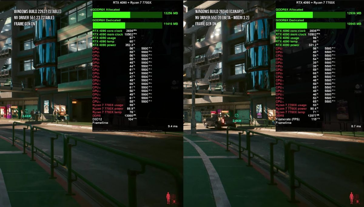 Insomma la base hardware di partenza è senz’altro una macchina coi fiocchi, d’altro canto la prova è stata effettuata con una serie di test tutti renderizzando il gioco in 4K, puntando quindi alle massime prestazioni possibili. Il risultato è notevole: sia con che senza l’attivazione della generazione di frame, il nuovo beta Driver contribuisce a fornisce prestazione migliori nell’esecuzione di Cyberpunk 2077. Con la frame gem disattivata, la build di Windows Insider differisce molto poco dall’attuale build stabile del sistema operativo, sia in termini di FPS medi sia di picchi massimi e minimi. Ma appena si attiva la generazione di frame, funzione propria del DLSS 3, la differenza diventa sensibile: si parla di un miglioramento del 23% nelle performance dell’accoppiata Beta Driver + build Insider rispetto alla coppia Driver stabile + build stabile.
