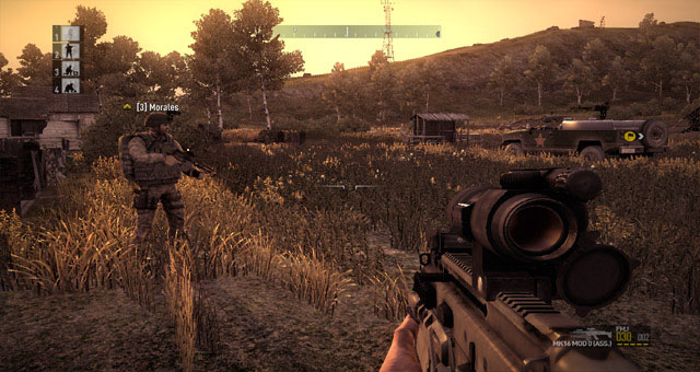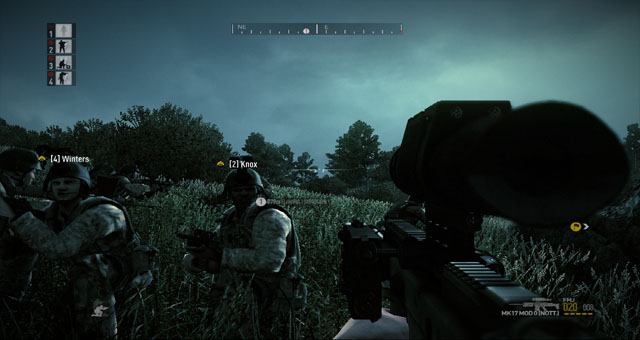 Spulciare il menù dei comandi è dunque davvero semplice e grazie anche ai soliti comandi di movimento che si usano in quasi tutti gli FPS (w, a, s, d), si potrà scegliere in un millesimo di secondo il comando da impartire non solo al singolo soldato ma anche all’intera squadra con la pressione dei tasti numerici (dal 2 al 4) per le unità al nostro comando. Devo essere sincero, forse sulle prime si farà un pochino di confusione ma questo sistema risulterà davvero comodo che non quello di doversi ricordare ogni comando vocale a fronte di una decina di tasti sparsi per tutta la tastiera, come capitava ad esempio in ArmA 2. Sempre per quanto riguarda i comandi, semplicissimo e immediato anche il dover cambiare cadenza di fuoco o dotazione dell’arma, mi spiego meglio: immaginate di imbracciare un fucile d’assalto con la possibilità di sparare granate a frammentazione, onde evitare di fare confusione basterà semplicemente schiacciare il comando dell’arma (in questo caso di solito è il tasto 2, visto che il tasto 1 è assegnato al coltello) e vedrete la figura e l’animazione del soldato che cambia il bussolotto del fucile. Per tornare alla modalità precedente basterà schiacciare di nuovo lo stesso medesimo pulsante. Insomma, sistema semplice studiato per non incartarsi in mille comandi. Anche il menù del nostro inventario o delle armi sarà richiamabile e gestibile tramite l’ausilio di un solo tasto e dei comandi di movimento. Facile.