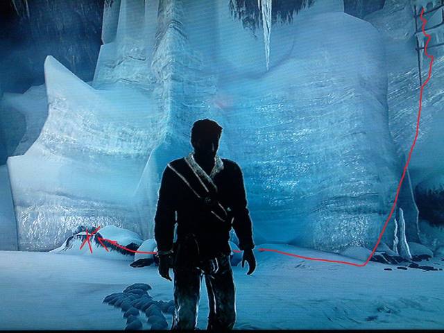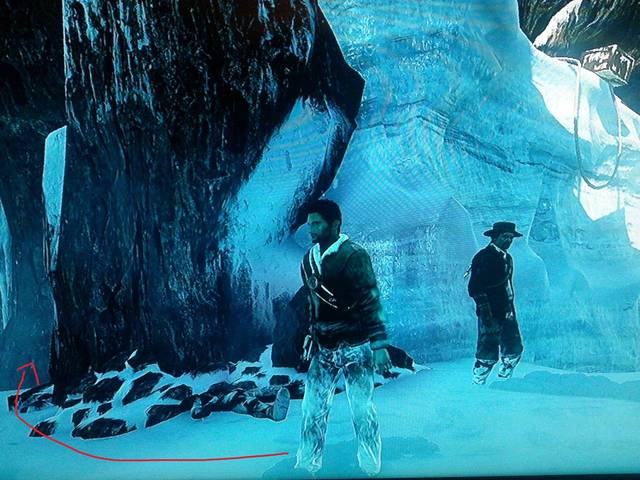 Statua di bronzo di Chenrezig: Dopo che Tenzin vi avrà aiutato a salire attraversate il crepaccio attraversate il crepaccio aggrappandovi alle sporgenze sulla destra. Prima di salire sulla corda vicino ai resti di una tenda proseguite avanti scendendo in basso per trovare il tesoro.